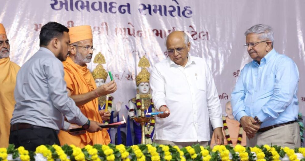 મુખ્યમંત્રી શ્રી ભૂપેન્દ્રભાઈ પટેલનો વલસાડ જિલ્લાના ધરમપુર ખાતે પૂ.પ્રમુખસ્વામી મહારાજની જન્મજયંતીના ઉપલક્ષ્યમાં પ્રમુખસ્વામી વોકેશનલ ટ્રેનિંગ સેન્ટર દ્વારા અભિવાદન સમારોહ યોજાયો હતો